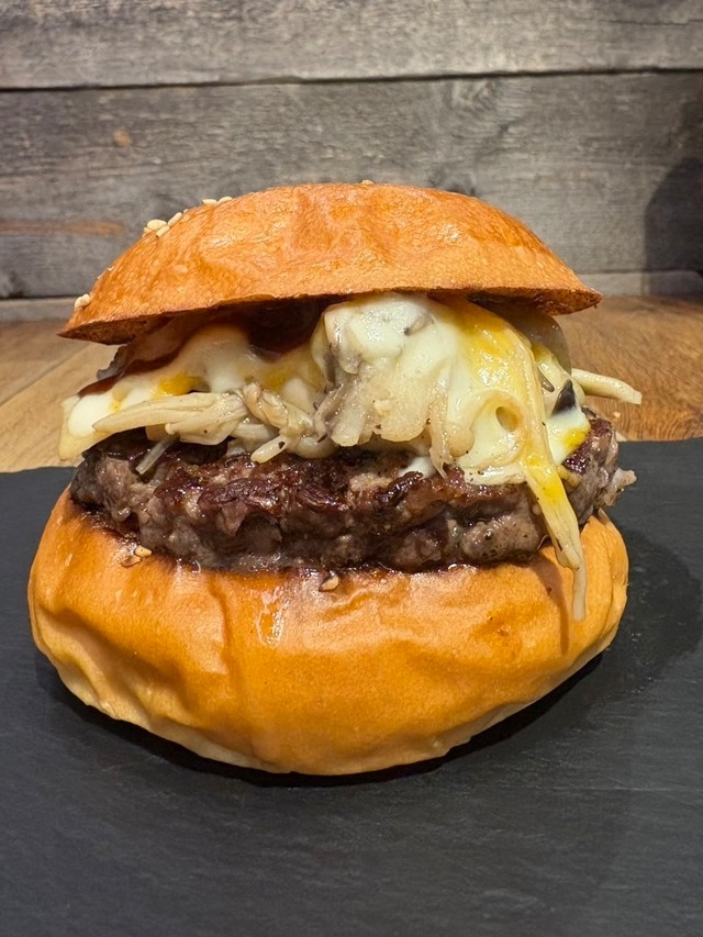 2025年10月のマンスリーバーガーは 「4種のキノコのチーズチーズバーガー」です! 芳醇な香りと旨みが凝縮された、えのき・ぶなしめじ・エリンギ・舞茸の4種のきのこをバターで贅沢にソテーし、 近江牛のジューシーなパティにたっぷりと重ねました。とろけるチェダーとモッツァレラのWチーズが濃厚に絡み合い、口に運ぶたびに旨みの層が広がる、 秋の恵みを丸ごと頬張る、至福のグルメバーガーです。 近江牛100%パティ、エノキ、ぶなしめじ、エリンギ、舞茸、チェダーチーズ、モッツァレラチーズ 全てのバーガーにミニサイズのフレンチフライ&オニオンリング付き ※価格に袋・容器代含みます